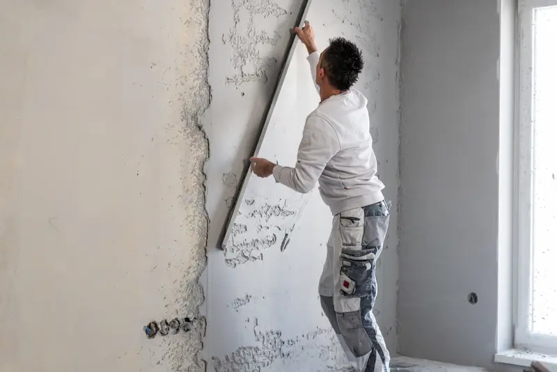 Een stukadoor uit Den Bosch, een vakman gespecialiseerd in het afwerken van muren en plafonds met pleisterwerk, voert het werk uit.